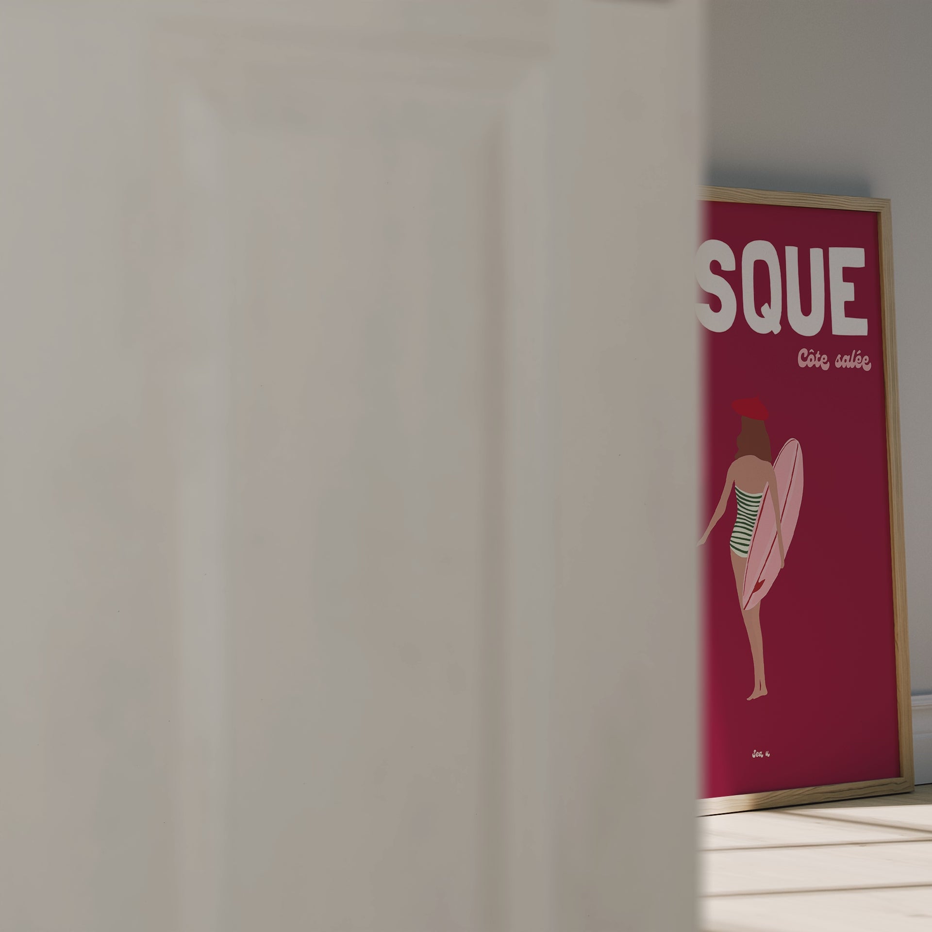 Portée par une surfeuse au béret rouge iconique et au maillot rayé blanc et vert, cette affiche mêle esprit libre, élégance et références locales, dans un équilibre subtil entre tradition et modernité. Une illustration murale décorative au caractère assumé, pensée pour apporter énergie, personnalité et authenticité à l’intérieur.