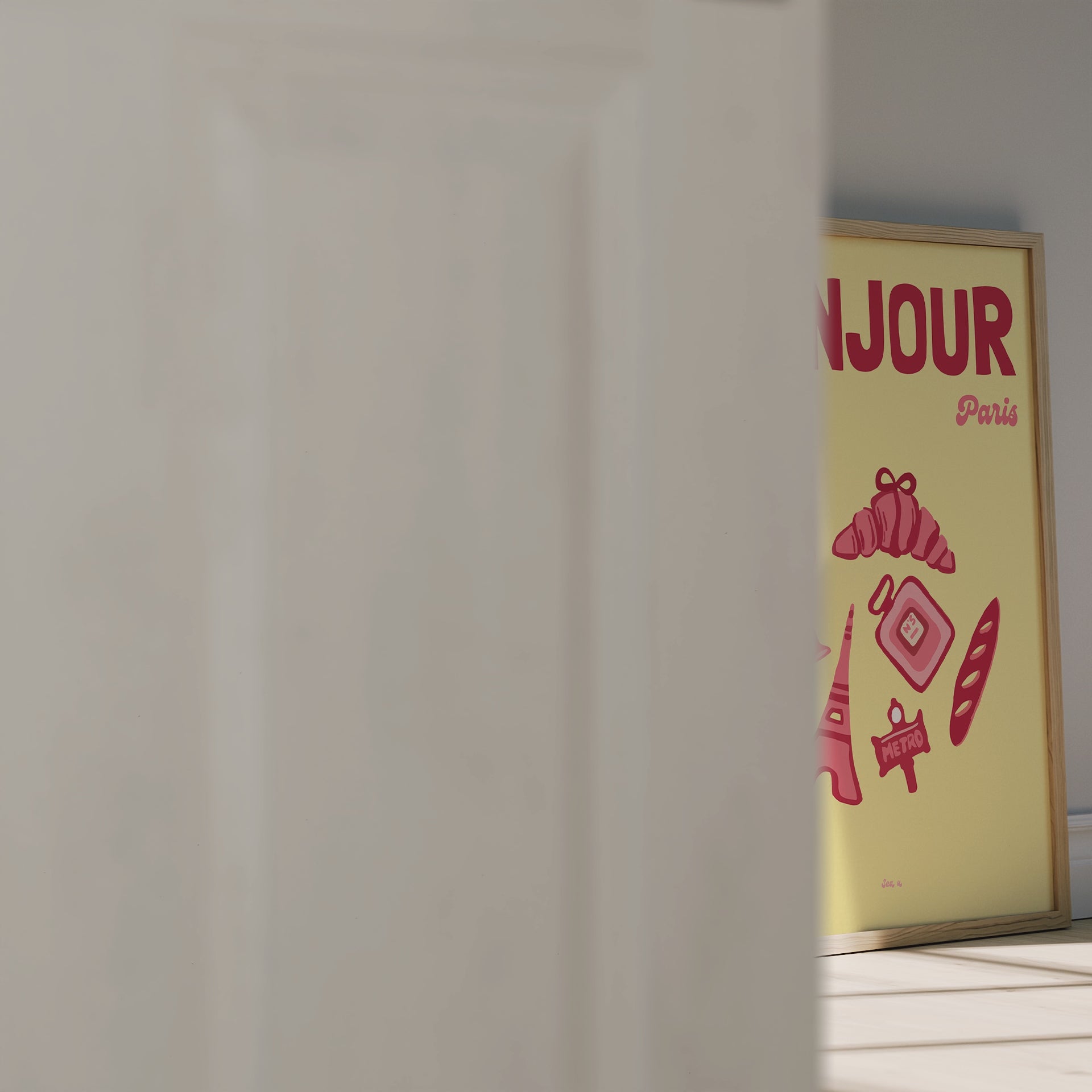 BONJOUR Paris est une affiche qui célèbre les emblèmes intemporels de la ville de Paris : croissant, baguette, parfum iconique Chanel ou encore Tour Eiffel.