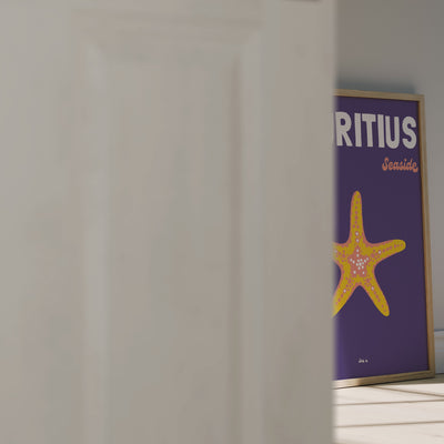 MAURITIUS Seaside est une affiche illustrée inspirée par la douceur des rivages mauriciens, entre lagon turquoise, sable clair et végétation luxuriante.