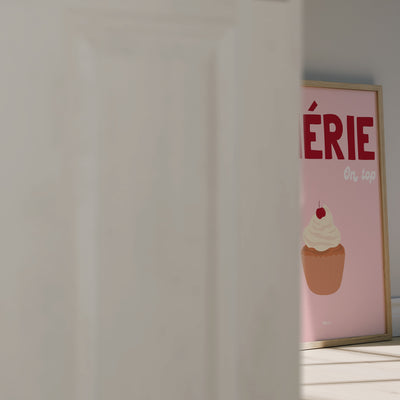CHÉRIE On Top est une affiche illustrée qui joue avec humour et élégance sur l’expression la cerise sur le gâteau. À travers le dessin d’un gâteau surmonté d’une cerise, cette composition graphique mêle gourmandise, affection et confiance, comme une déclaration légère et assumée.
