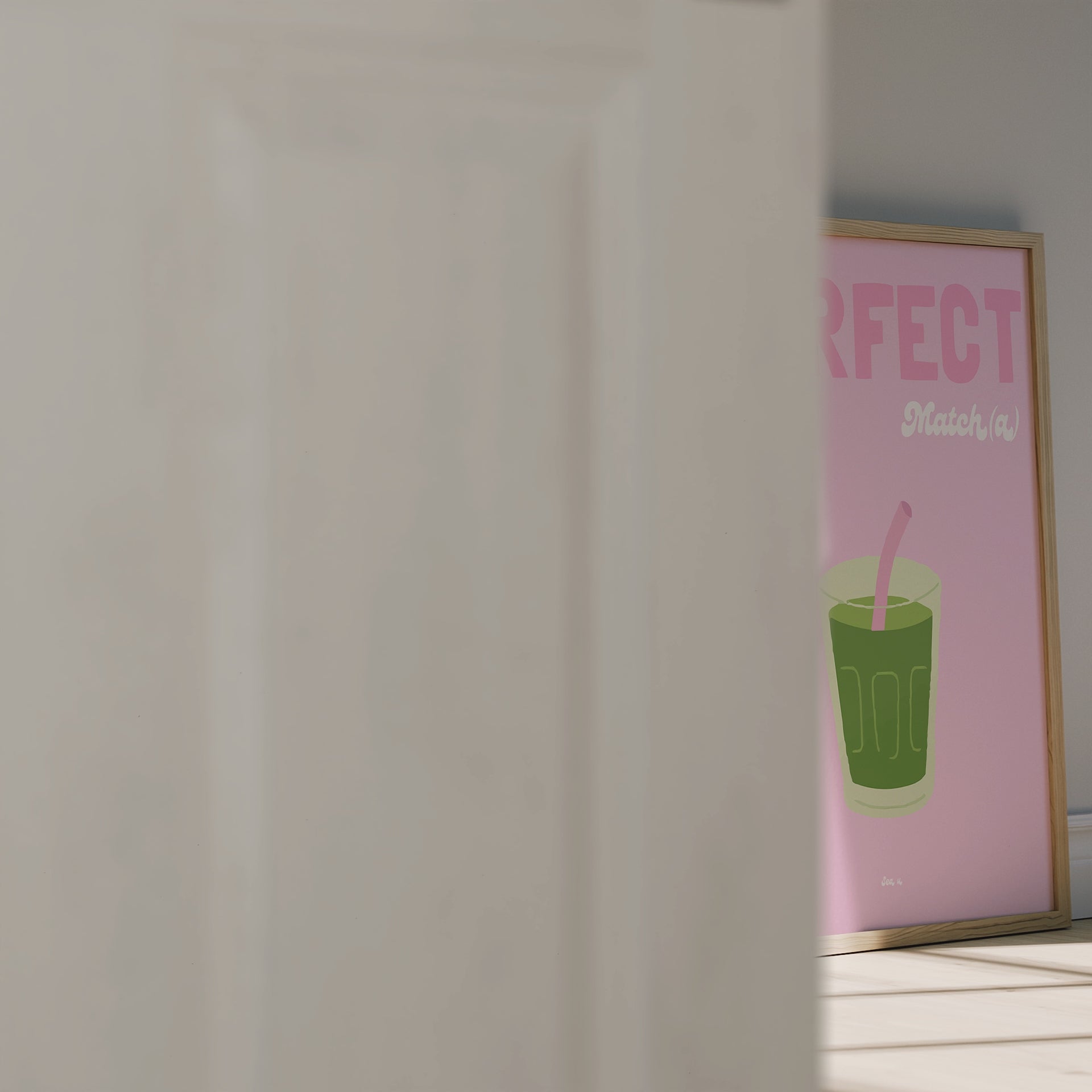 PERFECT Match(a) est une affiche illustrée qui joue avec humour et douceur sur l’idée de la rencontre parfaite. Autour d’un dessin de matcha stylisé, cette composition graphique évoque l’équilibre, le bien-être et ces petits plaisirs du quotidien qui font toute la différence.
