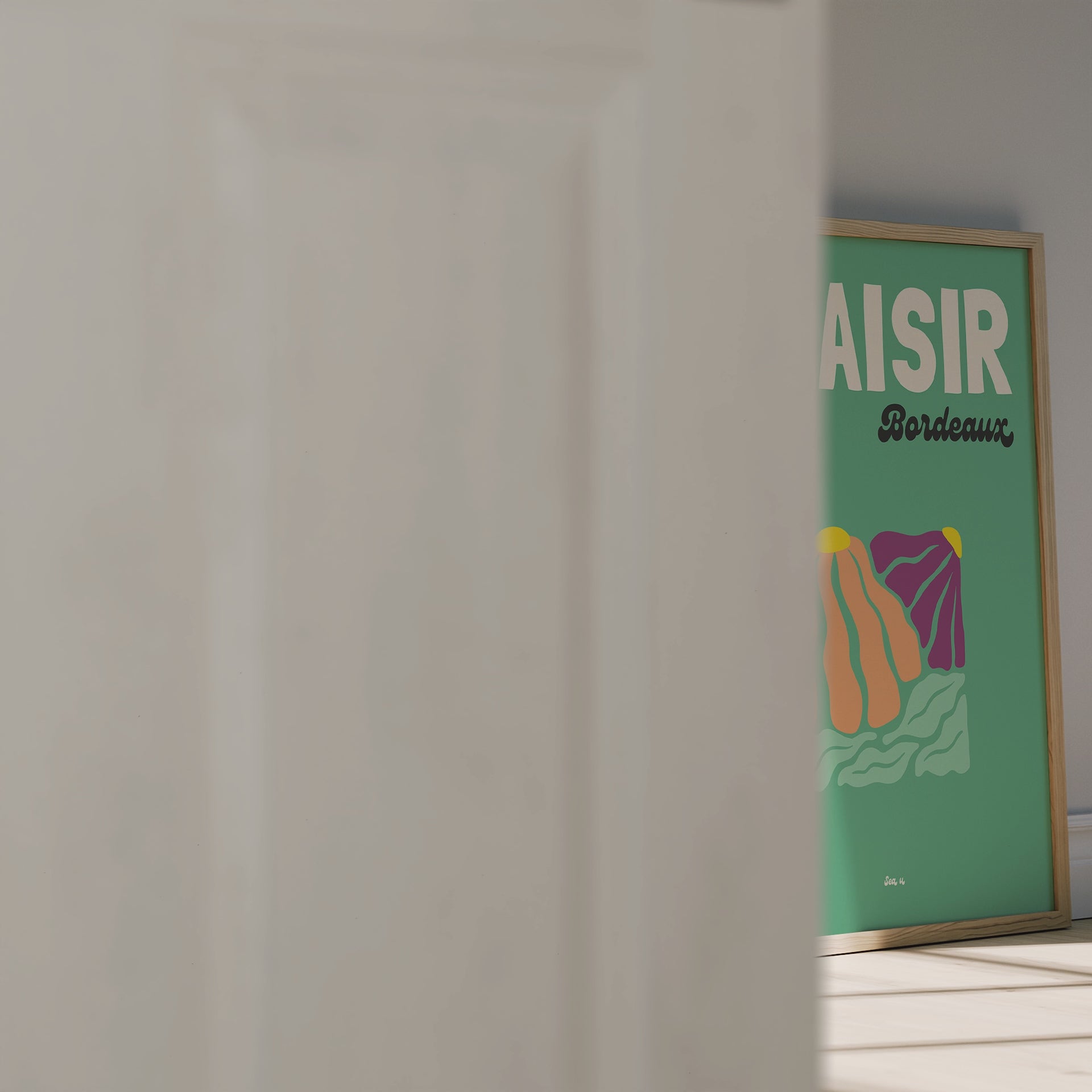 PLAISIR Bordeaux est une affiche inspirée par l’art de savourer l’instant, entre douceur de vivre, sensualité discrète et plaisir simple. Cette façon bien bordelaise d’apprécier la vie avec intensité et finesse.